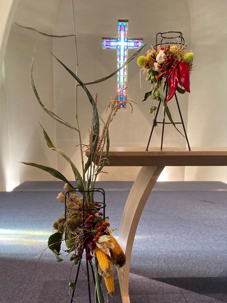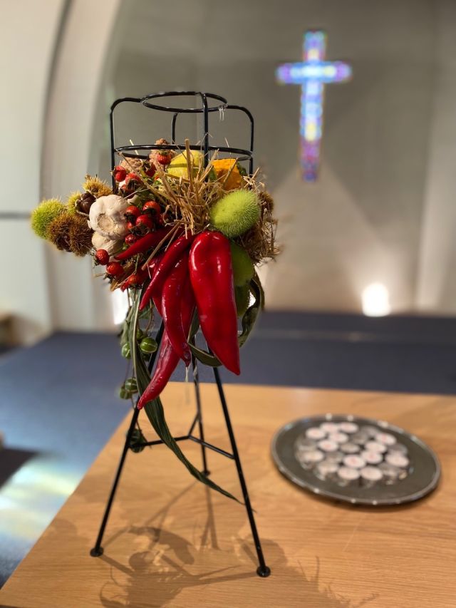 Liturgische schikking Pinksteren Thema: Vuur, wind en verbinding In het stuk zien we rode pepers en vuurpijlen die het vuur van Pinksteren verbeelden. De rode pinnen strekken zich uit naar alle windstreken. De kleuren van het vuur; rood en oranje ziet u in het stuk. De hedera die verwerkt is, staat voor de verbinding tussen God en de mensen.