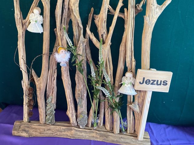 ![]() 2e advent op 7 december, Jesaja 11, 1-10. Thema: Jesaja spreekt over de stronk van Isai, de familie van koning David. Voorwerp geluksbrenger: Kroon. Niemand doet kwaad, niemand sticht onheil op heel mijn heilige berg. Op die dag zal de telg van Isai als een vaandel voor alle volken staan. In de houten standaard komt meer kleur met roze bloemen. Bij de schikking ziet u de kroon. |